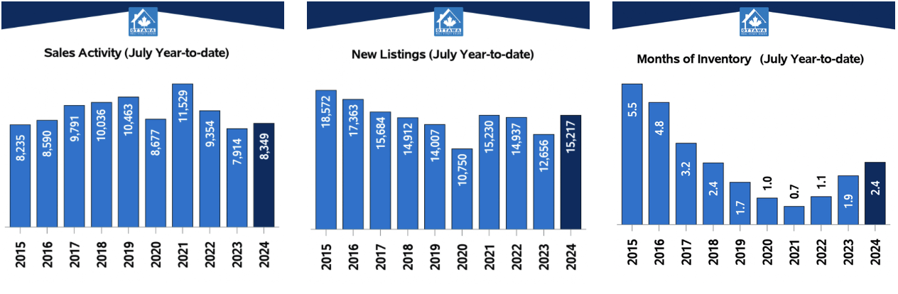 虽然7月的房屋销售量比过去五年的平均水平低了7.1%,比过去十年的平均水平低了8.8%,但今年以来的整体销售情况依旧乐观。截至2024年7月,今年渥太华的房屋销售总量已达8,349套,比去年同期增长了5.5%。